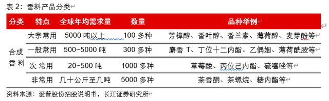 合成香料種類繁多,滿足市場差異化需求。合成香料產(chǎn)品中,世界年需求量在 5000 噸以上大宗常用的香料品種約有 100 多種,主要包括香蘭素、芳樟醇、香葉醇、β-苯乙醇、薄荷醇和麥芽酚等產(chǎn)品。合成香料產(chǎn)品種類繁多,能夠滿足香精產(chǎn)品差異化調(diào)配需求。