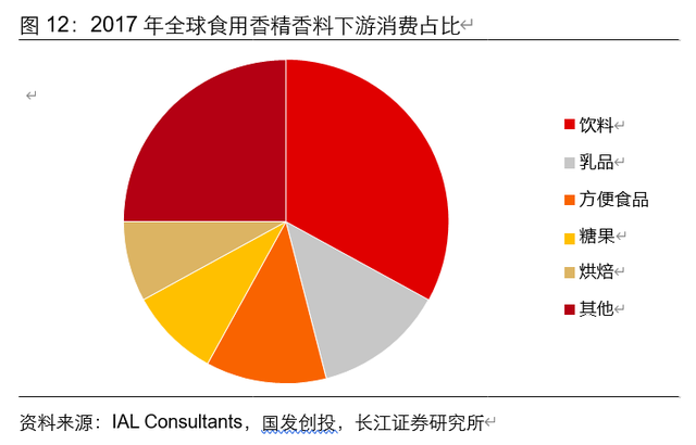 應用以食用和日化為主,作為嗅覺的“美化劑”。全球香精香料市場中,食用香精香料占比約為 56%,日用香精香料占比約為 44%(煙用香料市場規(guī)模相對較小,國外煙用香精香料劃分在食用香精香料領域)。食用香精香料能夠給食物原料賦予香味,矯正食品中的不良氣味,同時可以補充食品的香氣不足,穩(wěn)定和輔助食品中的固有香氣。食用香料主要應用于飲料、乳制品、方便食品、糖果和烘焙食品中,終端需求市場較為分散。日化香精香料主要用于矯正日化產(chǎn)品中不適的氣味,產(chǎn)生令人愉快的氣味,提升產(chǎn)品檔次,主要應用于香水、化妝品浴室用品清潔劑及洗滌劑等產(chǎn)品中。食品用香精又可以分為多個種類,其中規(guī)模占比最大的為飲料。整體看,全球香精香料下游消費較為分散, 單一市場需求變動對整體需求影響較為有限。下文將繼續(xù)從細分市場分析香精香料產(chǎn)品需求及增速。