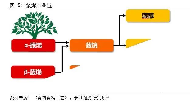 蒎烯:產(chǎn)業(yè)鏈下游需求集中于香葉醇和檸檬醛。蒎烯存在于天然松節(jié)油中,世界松節(jié)油年產(chǎn)量在 30 萬噸左右,蒎烯主要有 α 型和 β 型兩種異構體。全球蒎烯年生產(chǎn)量超過 9 萬噸,主要用于合成芳樟醇、香葉醇、檸檬醛等多種大宗香精香料。由于天然松節(jié)油主要從松樹松脂提取,自然產(chǎn)量受限,天然半合成市場供給仍趨緊。
