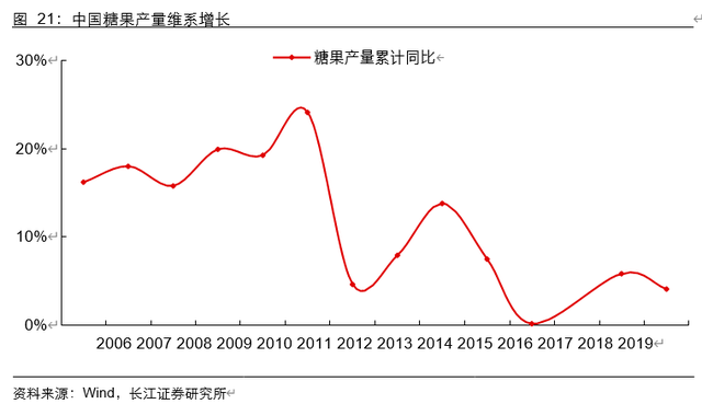食用市場:中國軟飲料及成品糖產(chǎn)量整體穩(wěn)中向上。據(jù)中國香化協(xié)會數(shù)據(jù),隨著我 國食品工業(yè)快速發(fā)展,我國食用香精香料需求快速增加,占整個香精香料市場比例 已經(jīng)超過 50%。今年疫情擾動了短期消費,而中長期不改行業(yè)趨勢。未來,國內(nèi)食品工業(yè)有望保持增長,帶動我國農(nóng)副食品加工、食品制造和飲料制造子行業(yè)增長, 食用香精香料需求仍有望維持較高增速。下游產(chǎn)品產(chǎn)量中,近幾年中國軟飲料和乳 品市場維持 5%左右增長,相關食用香料需求穩(wěn)定增加。中國糖果產(chǎn)量整體維持穩(wěn)定,糖果用香料仍能維系穩(wěn)定增長。隨著居民消費水平提升,軟飲料和乳品產(chǎn)量仍 有望維持增長,軟飲料和乳品相關香精香料需求有望提升。