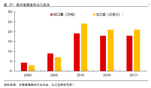 國內(nèi)出口香精香料較多。我國已在部分大宗香精香料領域形成核心競爭優(yōu)勢,出口產(chǎn)品集中在香蘭素、香豆素、麥芽酚等多種大宗香精香料產(chǎn)品。2015 年到 2017 年國內(nèi)香精香料產(chǎn)品出口量維持在 18 萬噸左右,出口量占總產(chǎn)量比例在 30%左右。