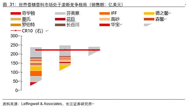 市場高度壟斷,逐漸形成“四大金剛”格局。全球香精香料市場壟斷在前 10 家巨頭企業(yè)手中,2017 年行業(yè) CR10 為 77.0%,且隨著龍頭專利布局加強,產(chǎn)品布局拓寬,行業(yè)護城河加深,市場集中度有進一步提升的趨勢。全球香精香料市場,已經(jīng)形成“四超多強”的供給格局,奇華頓、芬美意、國際香精香料和德之馨四家企業(yè)位于行業(yè)第一梯隊,第二梯隊主要為日本、美國和中國的企業(yè)如曼氏、Frutarom(2018 年被IFF 收購)、高砂、森馨、羅伯特(芬美意持股)、長谷川和華寶國際。