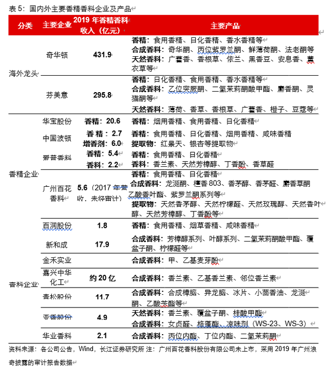 國內(nèi)營收規(guī)模較小,綜合性香精香料企業(yè)較少。海外龍頭企業(yè)如奇華頓和芬美意,營收規(guī)模龐大,產(chǎn)品結(jié)構豐富,產(chǎn)業(yè)鏈布局完善,在天然香料、合成香料和香精配方均有布局,形成完整的產(chǎn)業(yè)鏈布局。香精企業(yè)中,華寶國際、中國波頓、愛普香料等在食用香精、日化香精和煙用香精領域各有所長。香料企業(yè)中,新和成、金禾實業(yè)和嘉興中華化工以合成香料為主,青松股份以天然香料為主,亞香股份在天然香料和合成香料均有所布局。與國外企業(yè)相比,我國香精香料企業(yè)規(guī)模較小,產(chǎn)業(yè)鏈一體化程度仍有較大提升空間。