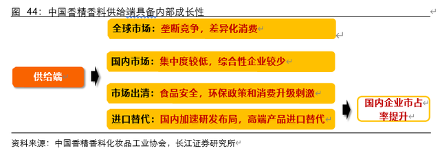 展望未來,國內(nèi)香精香料市場面臨較高的增長動力,消費屬性逐步增強,具備一定成長性。供給端,大型香料企業(yè)逐步布局高端香料產(chǎn)品,有望形成較強專利壁壘,擠出小型企業(yè)市場份額,替代進口產(chǎn)品,市占率提升,賦予龍頭企業(yè)內(nèi)部成長性。