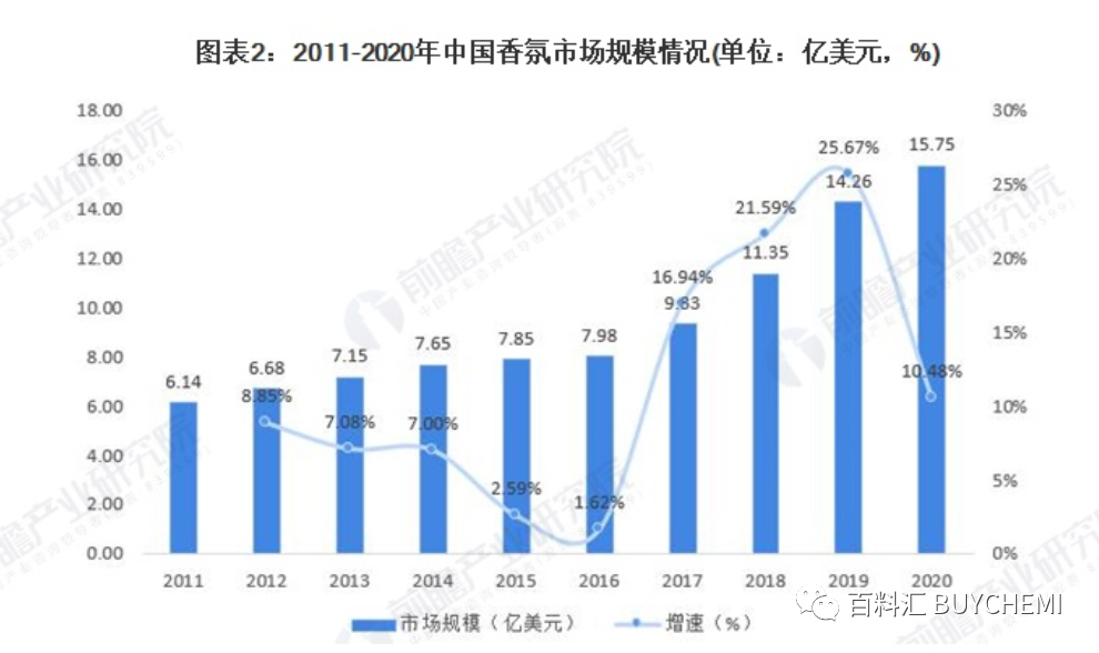 2011-2016年,由于使用香氛在國內(nèi)還未形成普遍的消費習(xí)慣,故市場規(guī)模相比其他日化子類較低。但是,2016年后,隨著中產(chǎn)階級人口逐漸增多,香氛產(chǎn)品作為能夠襯托出生活品質(zhì)的產(chǎn)品,香氛市場銷售量呈現(xiàn)爆發(fā)式上漲。與此同時,在個性化的當(dāng)下,氣味個性化成為了消費者展現(xiàn)自我的一種表達方式,對香氛的需求也逐漸增多,2020年我國香氛市場規(guī)模達到了15.75億美元,疫情沖擊下市場規(guī)模同比增長率仍然達到10.48%。