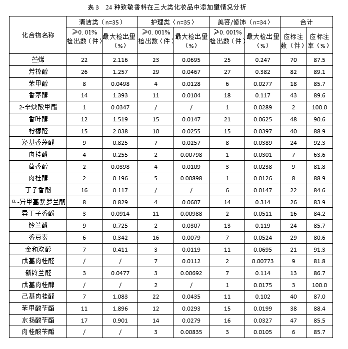 表3可知,歐盟化妝品法規(guī)規(guī)定符合“在不可沖洗型化妝品中含量≥0. 001%,在可沖洗型化妝品中含量≥0. 01%”條件時(shí),化妝品香料中26種致敏原物質(zhì)必須在化妝品標(biāo)簽上予以標(biāo)注。按照這個(gè)規(guī)定,104批檢出樣品應(yīng)在標(biāo)簽上進(jìn)行標(biāo)注的致敏香料除肉桂醛外其余23種香料的應(yīng)標(biāo)注率都達(dá)到80%左右,這說明國產(chǎn)化妝致敏香料添加量大部分超過歐盟化妝品法規(guī)中致敏香料須標(biāo)簽標(biāo)注的限量要求,如果在標(biāo)簽上標(biāo)注出具體香料成分,則可有效避免消費(fèi)者因無法獲知產(chǎn)品中香料的具體添加情況而可能出現(xiàn)選用不當(dāng)造成安全問題。