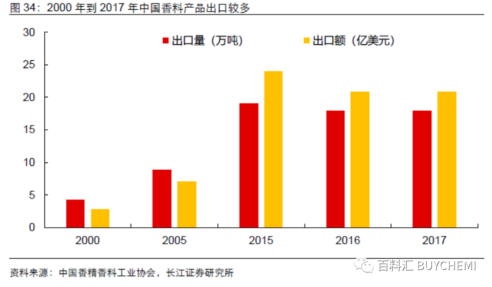 國(guó)際競(jìng)爭(zhēng)階段(2000-至今):新世紀(jì)以來(lái),我國(guó)化學(xué)合成工藝和分析儀器取得了較大突破,香精香料產(chǎn)品質(zhì)量進(jìn)一步提升,產(chǎn)品種類(lèi)得到進(jìn)一步豐富,產(chǎn)量進(jìn)一步擴(kuò)大,市場(chǎng)空間進(jìn)一步釋放。加入WTO 后,我國(guó)合成香料產(chǎn)業(yè)開(kāi)始逐步參與國(guó)際市場(chǎng)競(jìng)爭(zhēng),我國(guó)在合成β-苯乙醇、苯甲醛、香草醛等香精香料產(chǎn)品建立起自身的競(jìng)爭(zhēng)優(yōu)勢(shì),逐步由進(jìn)口依賴(lài)轉(zhuǎn)向?yàn)槌隹诎l(fā)展模式。此階段,中國(guó)在大宗香精香料產(chǎn)品形成一定成本優(yōu)勢(shì),在世界香精香料行業(yè)嶄露頭角。