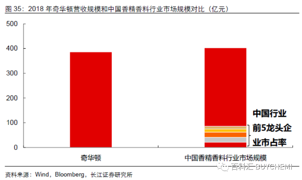 行業(yè)供給集中度較低,龍頭具備較大提升空間。相較于國(guó)外,我國(guó)香精香料行業(yè)集中度較低。2018 年,我國(guó)香精香料行業(yè)CR5 僅為21.2%(采用營(yíng)業(yè)收入前五的公司市場(chǎng)占比估算,不考慮外資公司在中國(guó)市場(chǎng)份額),與國(guó)外寡頭壟斷的格局相比集中度仍較低。