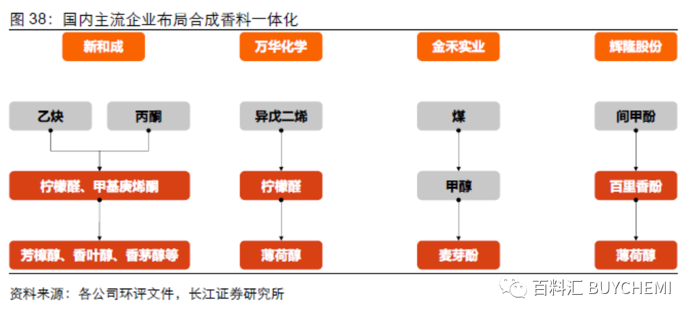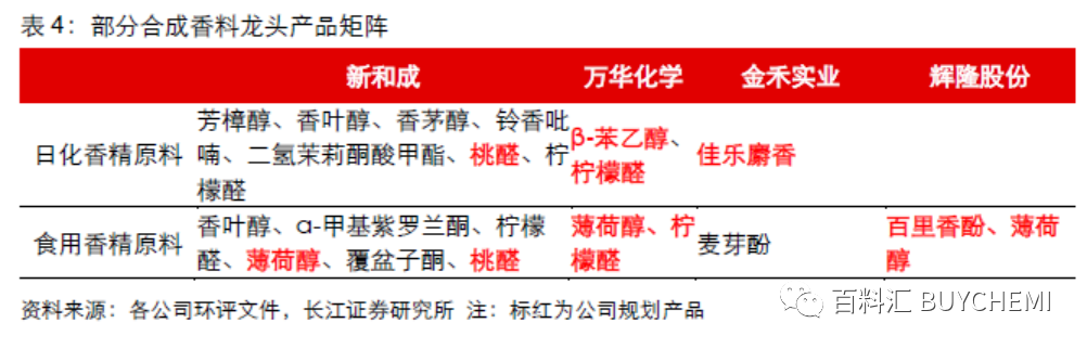 多元產(chǎn)品矩陣,提升消費(fèi)粘性。目前國(guó)內(nèi)合成香料企業(yè)中,新和成產(chǎn)品布局最完善,涵蓋日化香精和食用香精原料中多個(gè)產(chǎn)品,差異化產(chǎn)品涵蓋青草香、鈴蘭香、覆盆子香等多種香型,多元化產(chǎn)品結(jié)構(gòu)能滿足下游客戶復(fù)配需求。萬(wàn)華化學(xué)布局日化香精原料β-苯乙醇和食用香精原料薄荷醇和檸檬醛,一定程度滿足差異化布局。未來(lái)萬(wàn)華化學(xué)有望以檸檬醛為核心,拓展下游多個(gè)產(chǎn)品,進(jìn)一步豐富產(chǎn)品結(jié)構(gòu)。