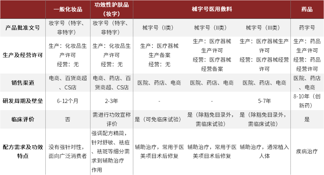 圖表: 功效性護膚品、械字號醫(yī)用敷料、藥品對比
