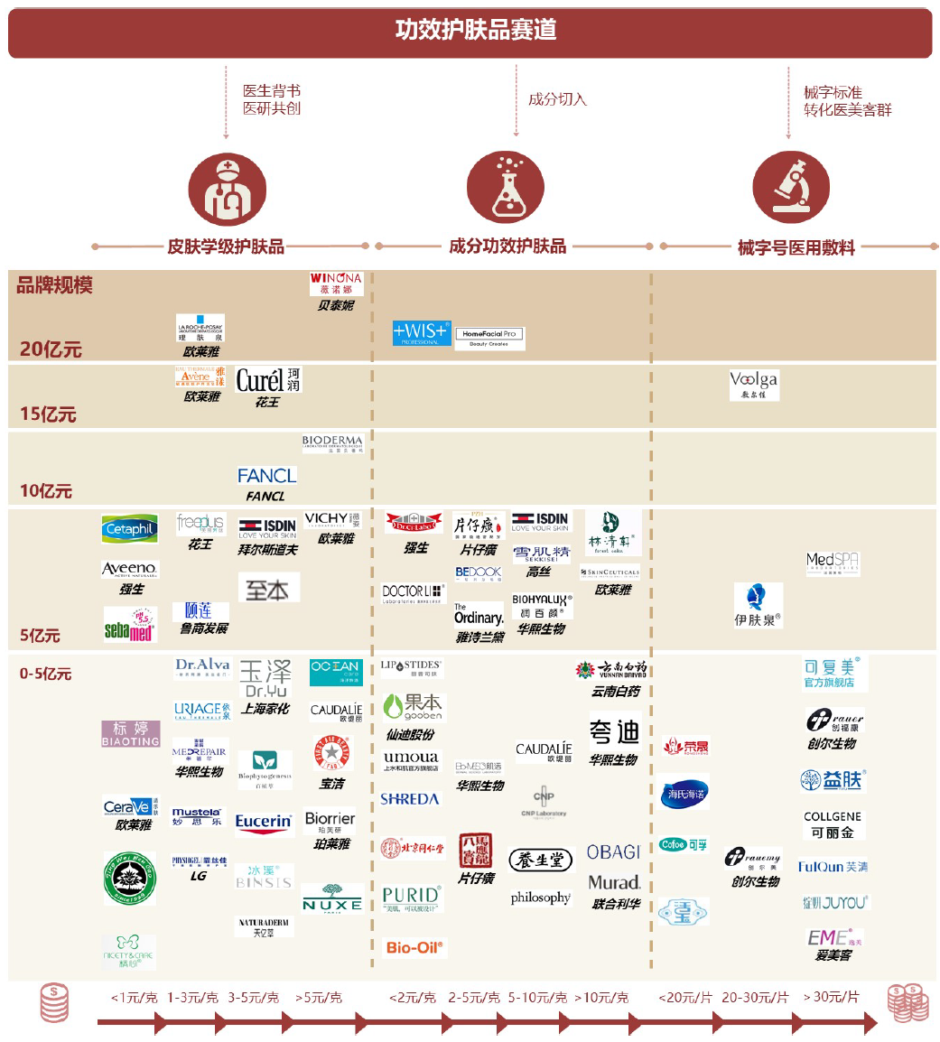 綜合功效護膚品的概念界定和監(jiān)管范疇,我們對市場上成規(guī)模的功效性護膚品牌進行了梳理,并繪制產(chǎn)業(yè)圖譜。我們將功效性護膚品牌劃分為三個陣營: