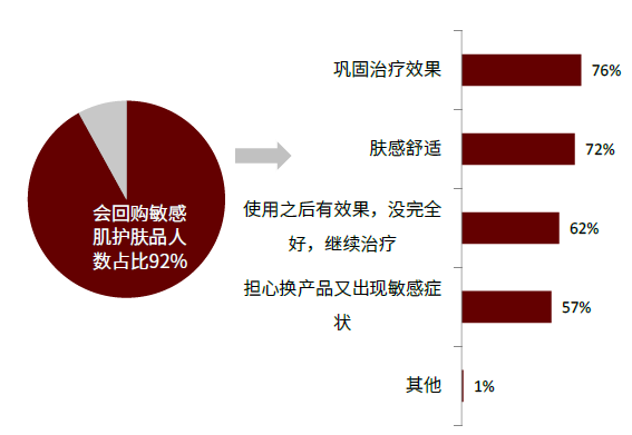 敏感肌人群品牌忠誠度高,回購意愿強。敏感肌膚頻繁更換護膚產(chǎn)品易引發(fā)過敏反應(yīng)或加重敏感程度,因而轉(zhuǎn)換成本及風險較高。品域美創(chuàng)調(diào)研(2019年5月發(fā)布)顯示,消費者回購敏感肌相關(guān)護膚品的比例高達92%。