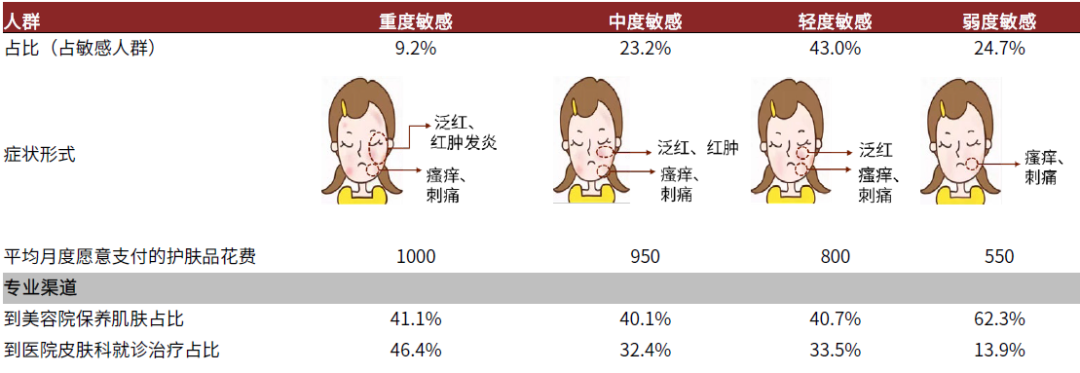 皮膚敏感程度不同,對皮膚學(xué)級護膚品的消費習(xí)慣亦有所差異,重度敏感肌人群是核心用戶。整體上,皮膚敏感程度越高的客群,其對于日常護膚越為重視,年度護膚品消費金額越高,對品牌回購意愿和依賴度更強,且更易由醫(yī)院/美容院等專業(yè)渠道轉(zhuǎn)化。