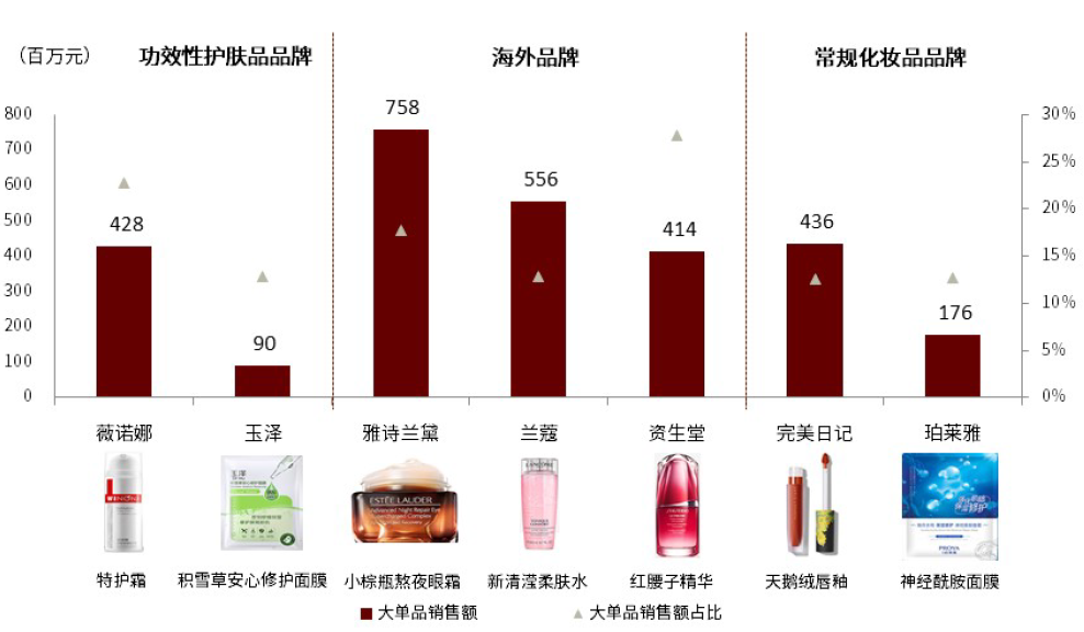 產(chǎn)品功效可見性強且差異化高,能夠打造市場認可的大單品。領(lǐng)先的化妝品品牌通常擁有幾款匯聚核心研究成果的大單品,代表性體現(xiàn)品牌產(chǎn)品力,形成持續(xù)復(fù)購和引流。