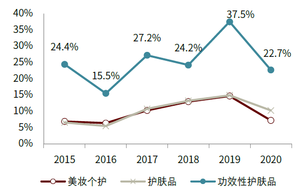 圖表: 功效性護膚品增速超過化妝品及護膚品