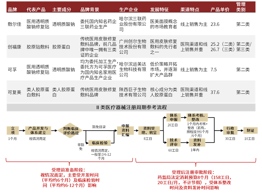 ?械字號醫(yī)用敷料(械字號為主):①界定:械字號醫(yī)用敷料、醫(yī)用敷貼,蘊含玻尿酸、膠原蛋白等成分,主要用于破皮類醫(yī)療美容術(shù)后修復(fù);②參與方:路徑上,一般是生物醫(yī)藥、Ⅲ類醫(yī)療器械背景的公司開展研發(fā),代表品牌包括芙清、敷爾佳、可復(fù)美、創(chuàng)???、綻妍等;也包括愛美客、伊膚泉等醫(yī)美器械企業(yè)。