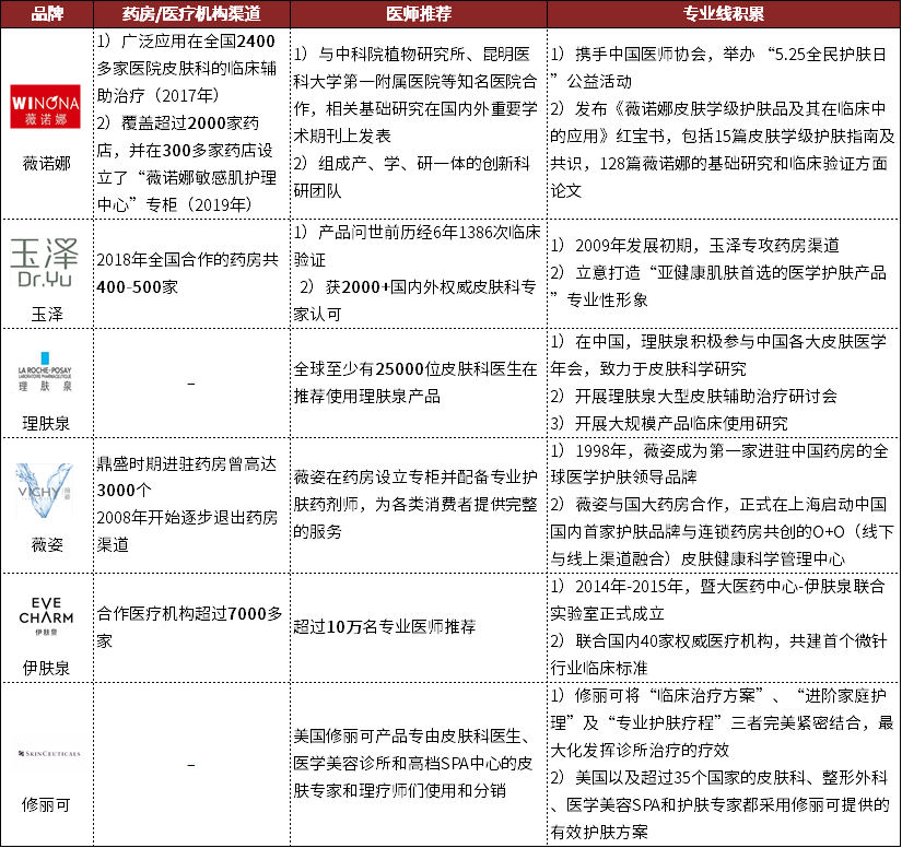 布局醫(yī)院、醫(yī)美等專業(yè)渠道,護城河深厚。部分功效性護膚品龍頭,憑借創(chuàng)始團隊的醫(yī)學(xué)資源、優(yōu)秀的產(chǎn)品力與強大的銷售團隊,率先切入皮膚科醫(yī)院、醫(yī)美診所等,與專業(yè)渠道建立了穩(wěn)定的合作關(guān)系。此外,部分功效性護膚品牌積極布局藥房渠道,充分發(fā)揮醫(yī)藥流通公司強大的物流網(wǎng)絡(luò)及廣闊的終端網(wǎng)點布局優(yōu)勢,迅速開拓市場。