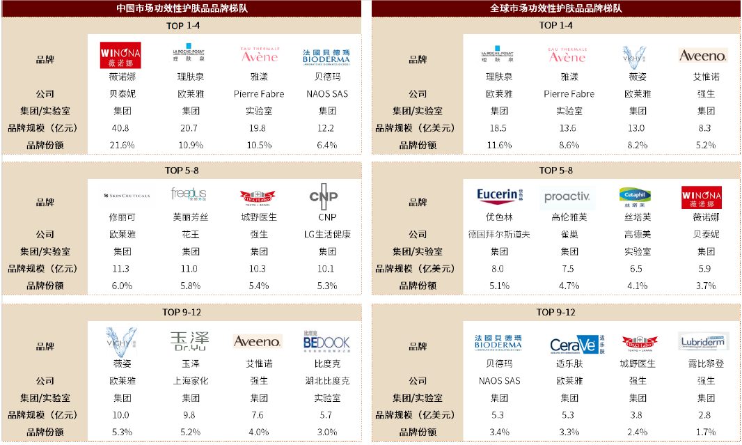 圖表: 中國及全球功效護膚品牌規(guī)模梯隊