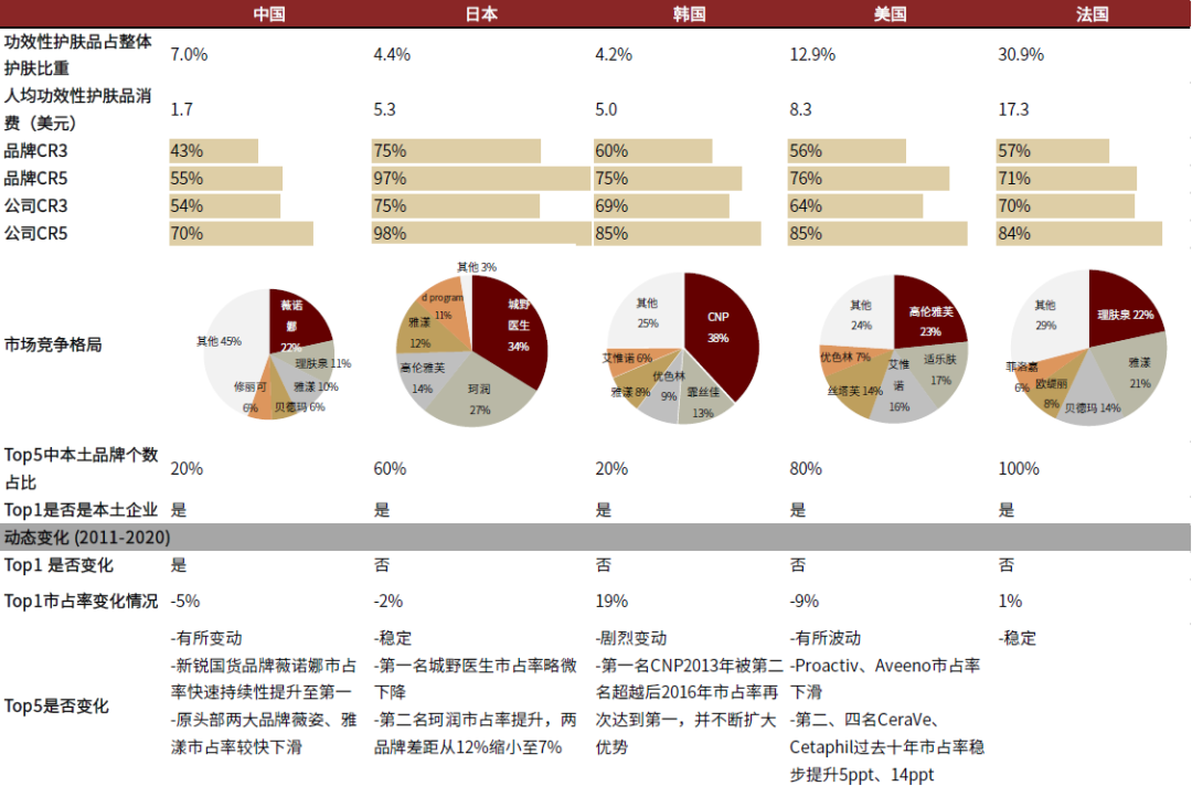 各國功效護膚市場集中度均較高,格局相對穩(wěn)定