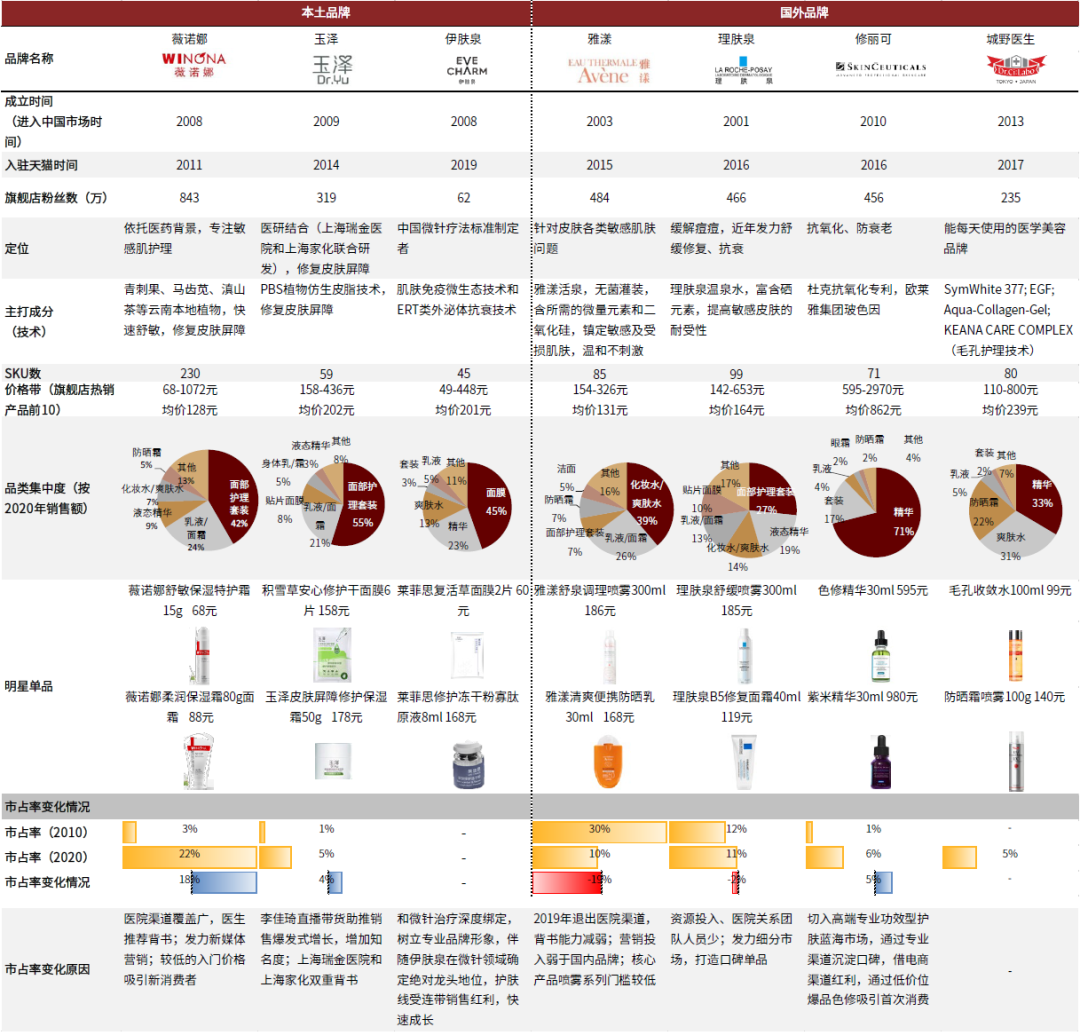 為什么功效性護膚品賽道具有更高壁壘?產(chǎn)品硬壁壘+營銷軟實力。盡管功效性護膚品的賽道門檻不及醫(yī)美,但頭部企業(yè)護城河深度不亞于后者。體現(xiàn)在:①產(chǎn)品端:功效性護膚品對特有成分、專利配方、研發(fā)實力、功效驗證等要求較高,帶來功效護膚賽道更強的大單品屬性和復(fù)購粘性;②營銷端:功效性護膚品通常面向敏感肌、醫(yī)美術(shù)后用戶,特殊客群決定了其差異化的營銷模式,進而在醫(yī)生、專家、私域、醫(yī)美機構(gòu)等專業(yè)渠道擁有較深積累,貫徹本土化營銷模式的品牌有望在營銷端構(gòu)筑軟性護城河。放眼全球,功效護膚賽道集中度高、格局穩(wěn)定,本土品牌優(yōu)勢顯著;聚焦國內(nèi),以薇諾娜、玉澤、潤百顏等為代表的國貨品牌快速崛起,持續(xù)搶占市場份額。