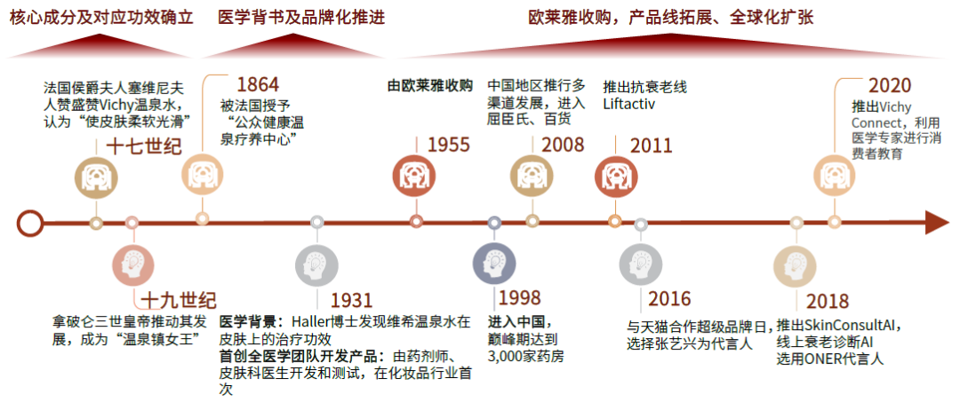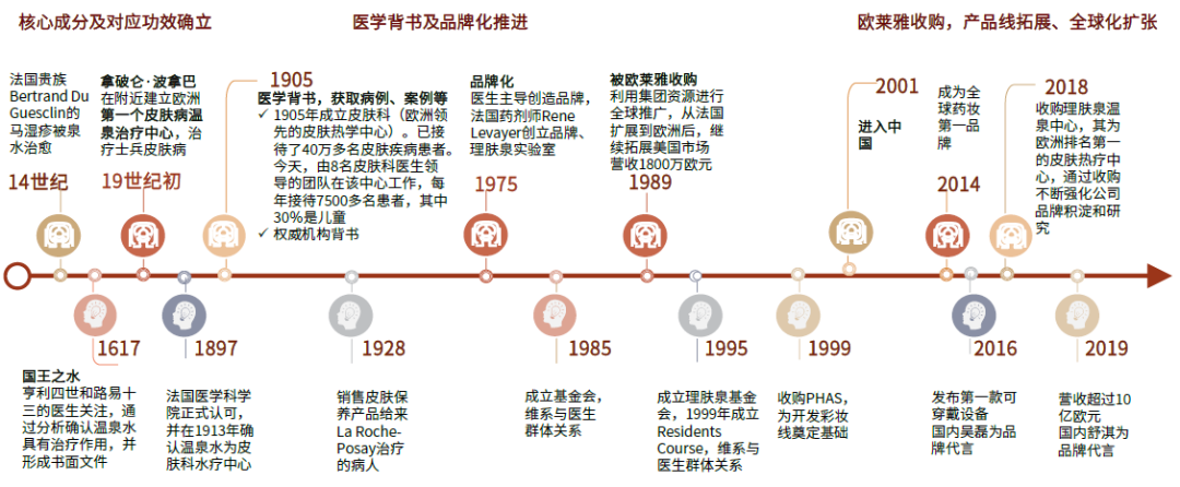 回顧理膚泉&薇姿兩個品牌的發(fā)展歷史,均經(jīng)歷了研發(fā)積累-品牌化-全球化三個階段: