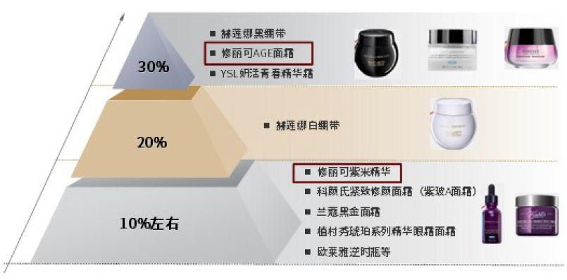 功效性護膚品強產(chǎn)品屬性的結(jié)果是更易形成明星大單品,從商業(yè)邏輯上,我們認為功效性護膚品的發(fā)展路徑更接近海外高端品牌,即以明星單品為引流核心,并依靠持續(xù)復(fù)購和產(chǎn)品線拓展形成的連帶購買贏得可持續(xù)成長。