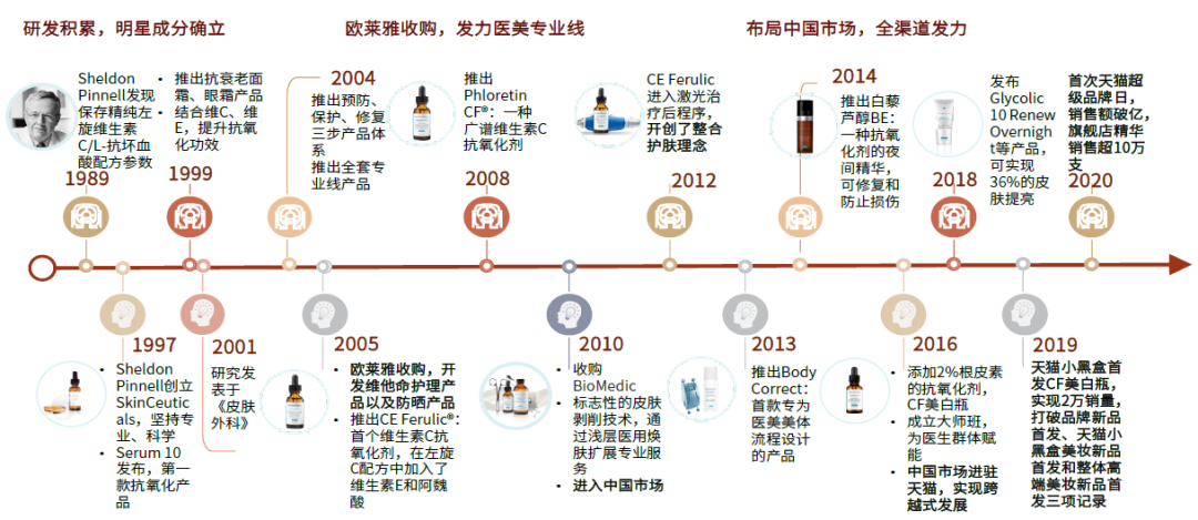 ? 歐萊雅收購,發(fā)力醫(yī)美線:自2005年歐萊雅收購以來,品牌優(yōu)化產(chǎn)品體驗,豐富產(chǎn)品組合,并創(chuàng)立包含術(shù)前、術(shù)后方案,整合臨床治療、居家護理與專業(yè)療程的“整全護膚”的概念,發(fā)力醫(yī)美;