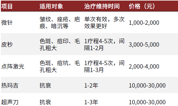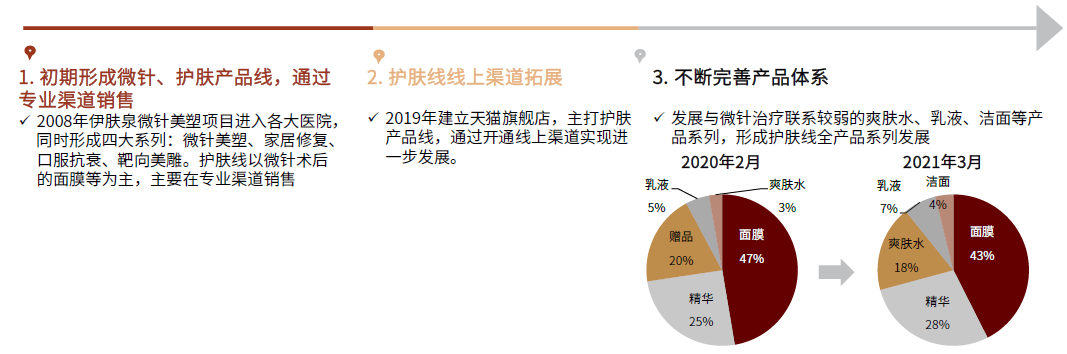 由于伊膚泉綁定的是療法而非特定產(chǎn)品,因而能夠圍繞該療法平臺,快速建立針對各類皮膚問題、人群的產(chǎn)品矩陣。在依托ToB渠道建立知名度后,伊膚泉發(fā)力ToC端的口碑打造,引入小白瓶、小綠瓶等大單品,雖然仍為醫(yī)美過程用品,但有助于實現(xiàn)品牌力向大眾市場出圈,為后續(xù)向非醫(yī)美領(lǐng)域拓展奠定基礎(chǔ)?,F(xiàn)階段,伊膚泉推出非醫(yī)美類化妝品,在天貓旗艦店等渠道銷售,我們認為有望對傳統(tǒng)護膚品實現(xiàn)降維打擊。