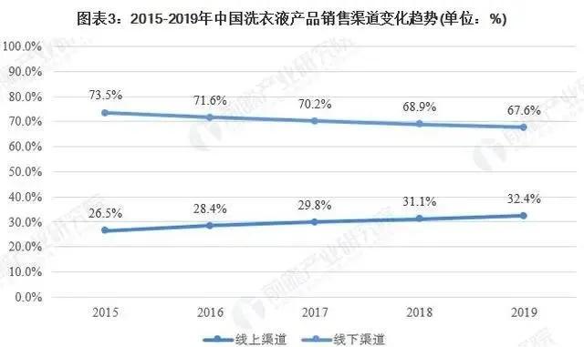 近年來,受益于中國(guó)電子商務(wù)平臺(tái)的發(fā)展,線上零售渠道已成為中國(guó)洗衣液行業(yè)增長(zhǎng)最快的銷售渠道,線上零售規(guī)模將由2015年的44億元增至2019年的88億元,業(yè)務(wù)規(guī)模翻倍。線上零售渠道占比由26.5%增長(zhǎng)至32.4%,預(yù)計(jì)未來,線上渠道市場(chǎng)份額將進(jìn)一步提升。