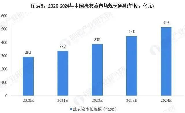 據(jù)弗若斯特沙利文推測(cè),2020-2024年,我國(guó)洗衣液行業(yè)仍將保持13.6%的年均復(fù)合增速高速增長(zhǎng),到2024年,全國(guó)洗衣液行業(yè)市場(chǎng)規(guī)模將超過500億元。