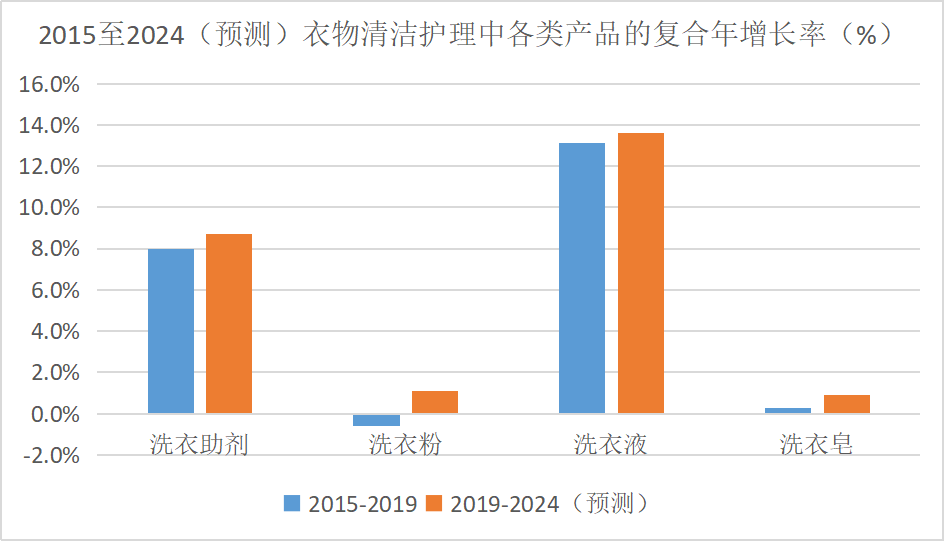數(shù)據(jù)顯示,目前洗衣液逐漸代替洗衣粉,成為衣物清潔洗護市場的消費主流。如下圖所示,2015年~2019年,在眾多的衣物清潔品類中,洗衣液以超過13%的年復合增長率,持續(xù)高速增長;洗衣粉的年復合增速則為負值。