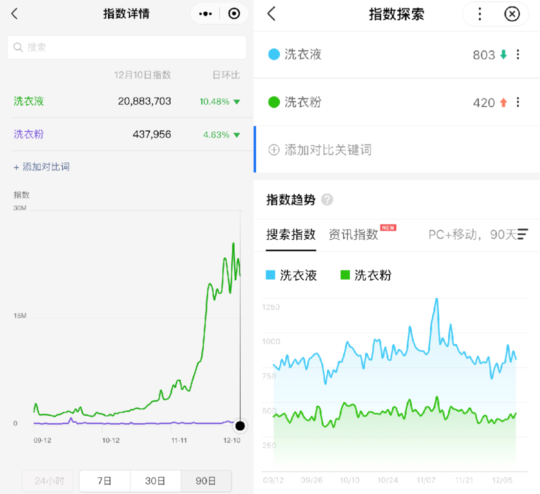 根據(jù)最近的微信指數(shù)(下圖左),洗衣液的熱度指數(shù)(90天內(nèi))以及環(huán)比增速,都遠高于洗衣粉;百度指數(shù)也是同樣的趨勢,洗衣液的搜索指數(shù)遠高于洗衣粉。