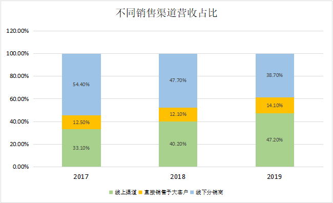 根據(jù)招股書數(shù)據(jù),在渠道結構上,藍月亮2017-2019年線上渠道貢獻的營收占比逐步提升,2019年線上營收占比總營收的47.1%。