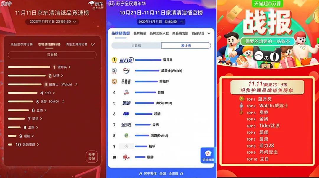 以今年雙十一為例,在京東、天貓、蘇寧三大平臺上,藍月亮的銷售額均排在第一位。
