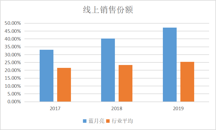 把握機會,重磅布局線上的藍月亮,業(yè)績快速釋放。如下圖所示,2017-2019年藍月亮線上銷售份額高于行業(yè)平均水平。