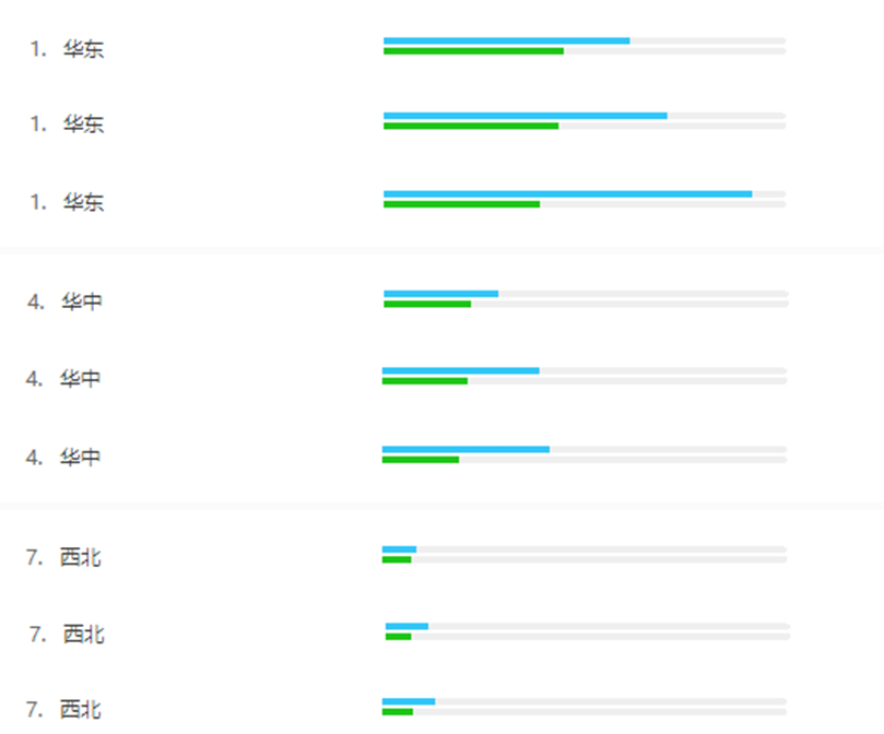 百度指數(shù)反饋顯示,隨著時間的推移,國內(nèi)洗衣液的滲透率的確呈上升趨勢。但滲透率程度在不同地區(qū),卻表現(xiàn)不同——從下圖可以看到,滲透率從東到西在依次減弱。
