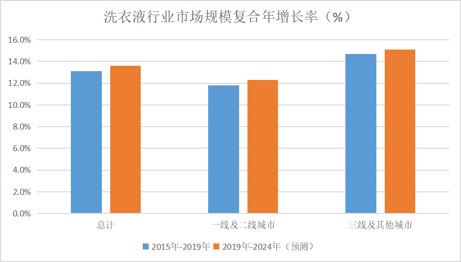 除了區(qū)域性分化,分級市場也表現(xiàn)出同樣的趨勢。對比2015年~2019年洗衣液在分級市場的年復合銷售增速,屬于下沉市場的三四線城市明顯高于一二線城市。