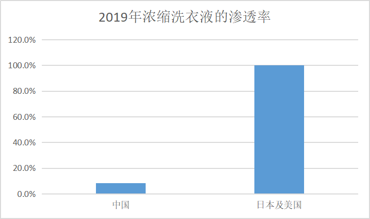 另一方面,洗衣液濃縮化已經(jīng)成為發(fā)達國家的主流消費趨勢。根據(jù)弗若斯特沙利文的報告,美國、日本2019年的濃縮洗衣液滲透率達到了100%,與之相比,中國2019年的濃縮洗衣液滲透率僅為8.2%。