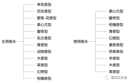 把香水香型分為女用和男用兩大類,每大類中又分為若干小類,如下所示。