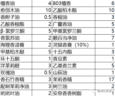 (9)木香(包括木香兼有龍涎香或壤香):檀香油(天然品)、803檀香、208檀香、檀香醚、伊斯波(ISO Esuper)、乙?;啬鞠?、甲基柏木醚、柏木油、乙酸柏木酯、廣藿香油、香根油、乙酸香根酯。