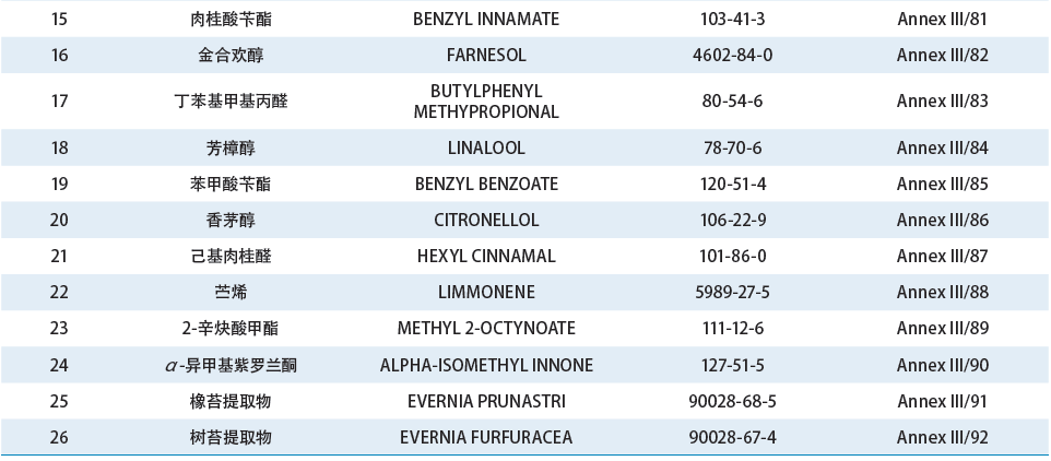 2、2009年歐盟公布了化妝品法規(guī),這使歐盟化妝品監(jiān)管的主要依據(jù)由指令上升為法規(guī)。對于化妝品中禁用的香料,歐盟幾乎全部接收IFRA提出的禁用名單。此外關(guān)于化妝品中限用香料歐盟還在法規(guī)中規(guī)定符合“在不可沖洗型化妝品中含量≥0.001%;在可沖洗型化妝品中含量≥0.01%”條件時(shí),化妝品香料中26種致敏原物質(zhì)必須在化妝品標(biāo)簽上予以標(biāo)注(在歐盟化妝品指令2005年修訂前規(guī)定香料成分免于標(biāo)簽標(biāo)注,僅以“香料或香精”標(biāo)出即可)。