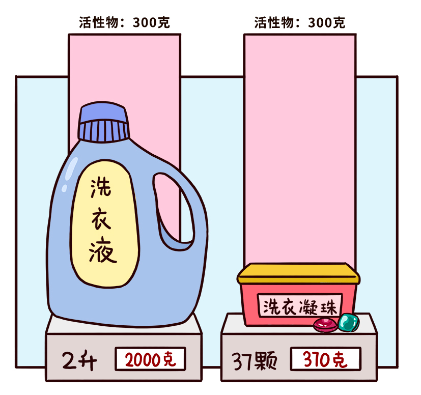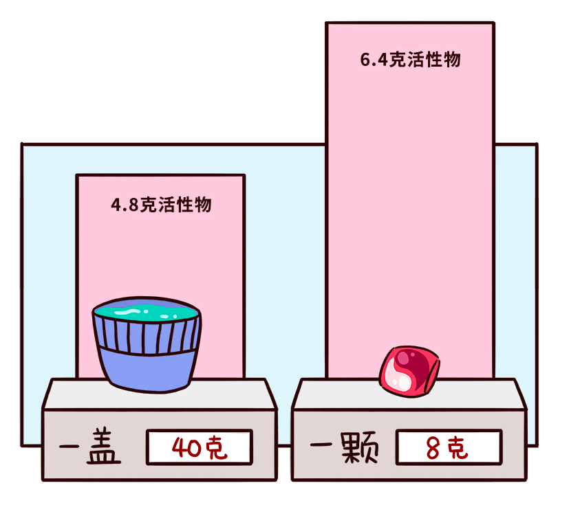 我們?cè)賮砜聪?,在同樣含量活性物的條件下,洗衣液和凝珠的量有多少。