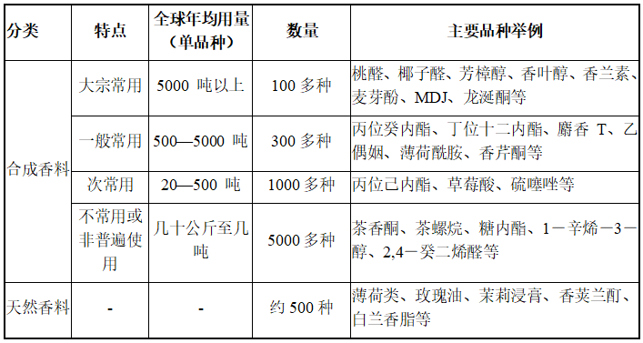 目前,世界上香料品種約7000種,數(shù)量眾多,其中合成香料約6000多種、天然香料(國際市場有名錄的)約500種。根據(jù)下游的用量及用途的不同,不同香料品種的市場需求量從幾十公斤至上萬噸不等,差異較大,基本情況如下: