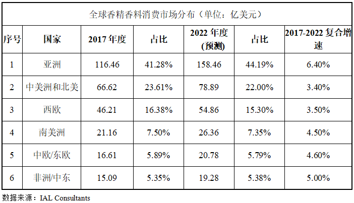 從全球范圍看,亞洲是香精香料市場最大的消費市場,約占全球市場的41.28%,緊隨其后的是北美以及西歐。盡管西歐和北美市場已十分成熟,但隨著消費者口味和偏好的不斷變化,對香精香料的需求仍然有一定的增長潛力。而發(fā)展中國家由于食品以及消費品的需求不斷增長,導(dǎo)致對于香精香料的消費額仍將繼續(xù)增長。