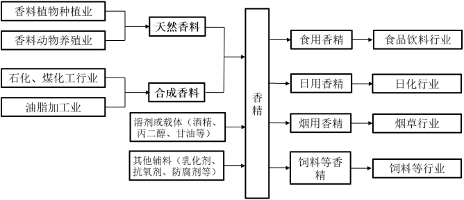 香精香料行業(yè)的上游包括香料植物種植、香料動物養(yǎng)殖、石化煤化工和油脂加工等行業(yè),下游主要為食品飲料、日化、煙草、飼料等行業(yè)。