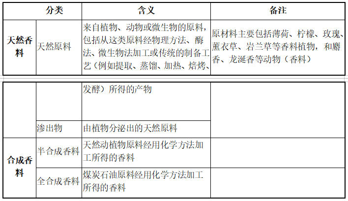 按原料來源及制造工藝的不同,香料分成天然香料和合成香料。天然香料的優(yōu)點是主要成分來源于天然,相對而言符合健康理念,產(chǎn)品味道層次豐富,但由于受到自然條件限制,數(shù)量有限,價格相對較高;合成香料通常由化工原料通過化學(xué)手段合成制成,合成香料的優(yōu)點是原材料來源廣泛,產(chǎn)品品類較天然香料豐富,缺點是味道層次單一,需要組合調(diào)配使用。