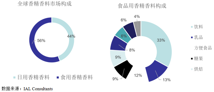 而全球香精香料市場中,食品用香精香料占比為56%,日用香精香料占比約為44%。食品用香精又可以分為多個種類,其中規(guī)模占比最大的為飲料,約占食品用香精規(guī)模的33%,而煙草用香精實際占比不足4%。