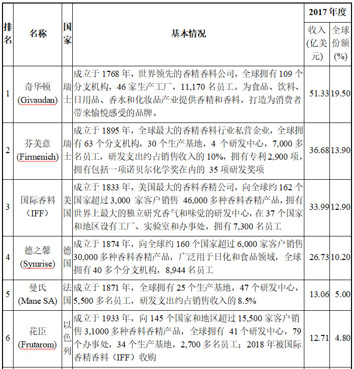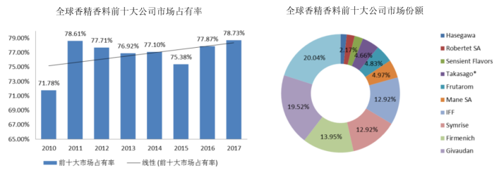 全球香精香料產(chǎn)業(yè)呈現(xiàn)高度壟斷格局,國際十大香精香料公司多集中于發(fā)達(dá)國家,代表企業(yè)有瑞士的奇華頓和芬美意、美國的國際香料香精和森馨、德國的德之馨、法國的曼氏和羅伯特,以及日本的高砂和長谷川等。在20世紀(jì)80年代,發(fā)達(dá)國家香料香精企業(yè)仍處于高度分散狀態(tài),自90年代以來,行業(yè)集中程度明顯加速,核心生產(chǎn)企業(yè)市場地位日趨穩(wěn)固,2017年前十大生產(chǎn)企業(yè)市占率達(dá)78.73%,頭部公司奇華頓的全球市場份額就高達(dá)20%。隨著2018年國際香料香精完成對花臣的收購,行業(yè)市場集中度更趨明顯。