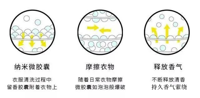 在洗滌時洗滌劑中的微膠囊香精會散落于織物纖維的間隙中,當(dāng)衣物干燥后 ,織物中的微膠囊香精通過觸碰或摩擦破裂,就會釋放出香氣,從而達(dá)到持久留香的效果。