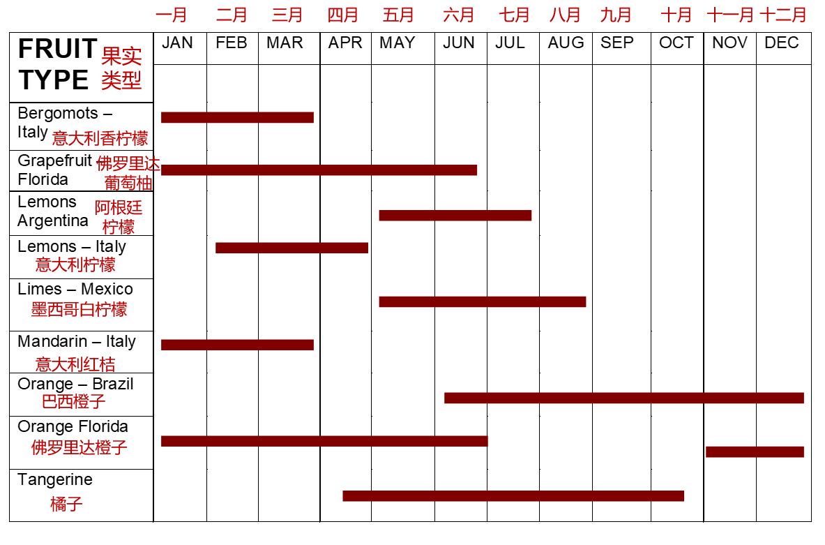 柑橘類品種繁多,以下是世界各地區(qū)主要的柑橘類果實(shí)的收成時(shí)間: